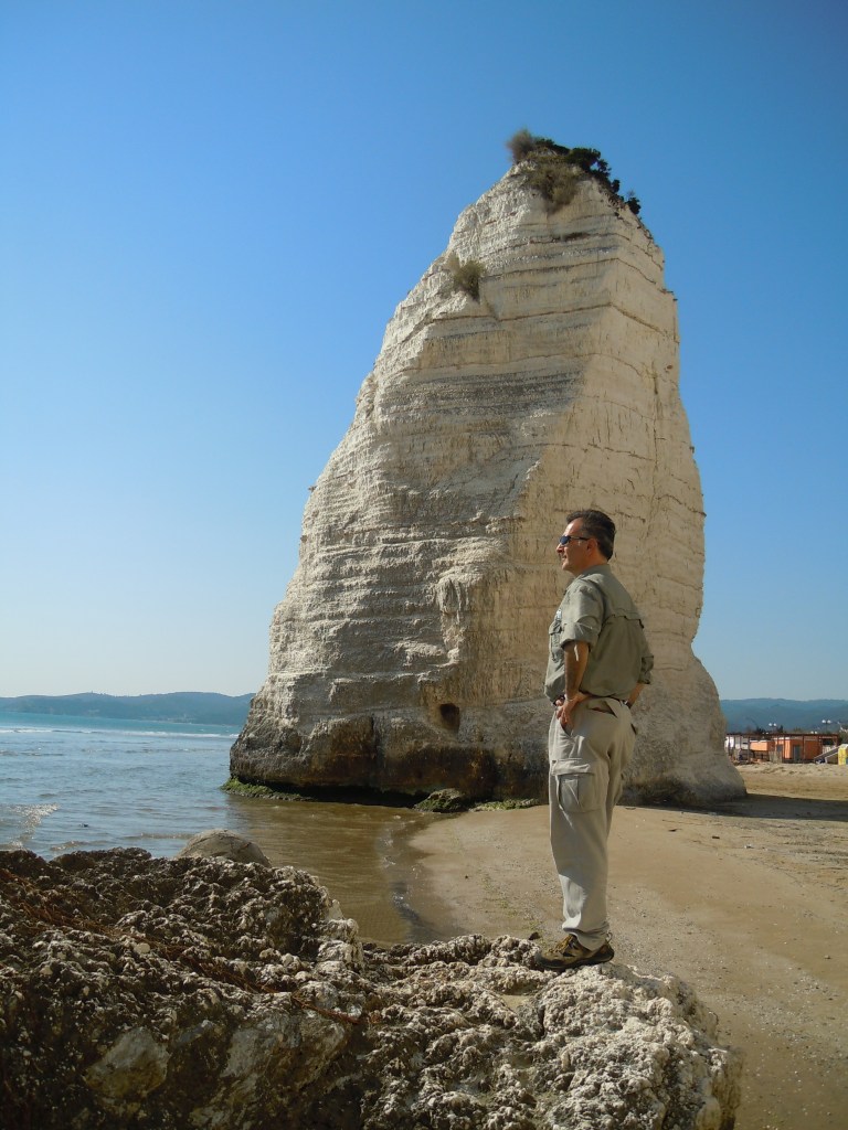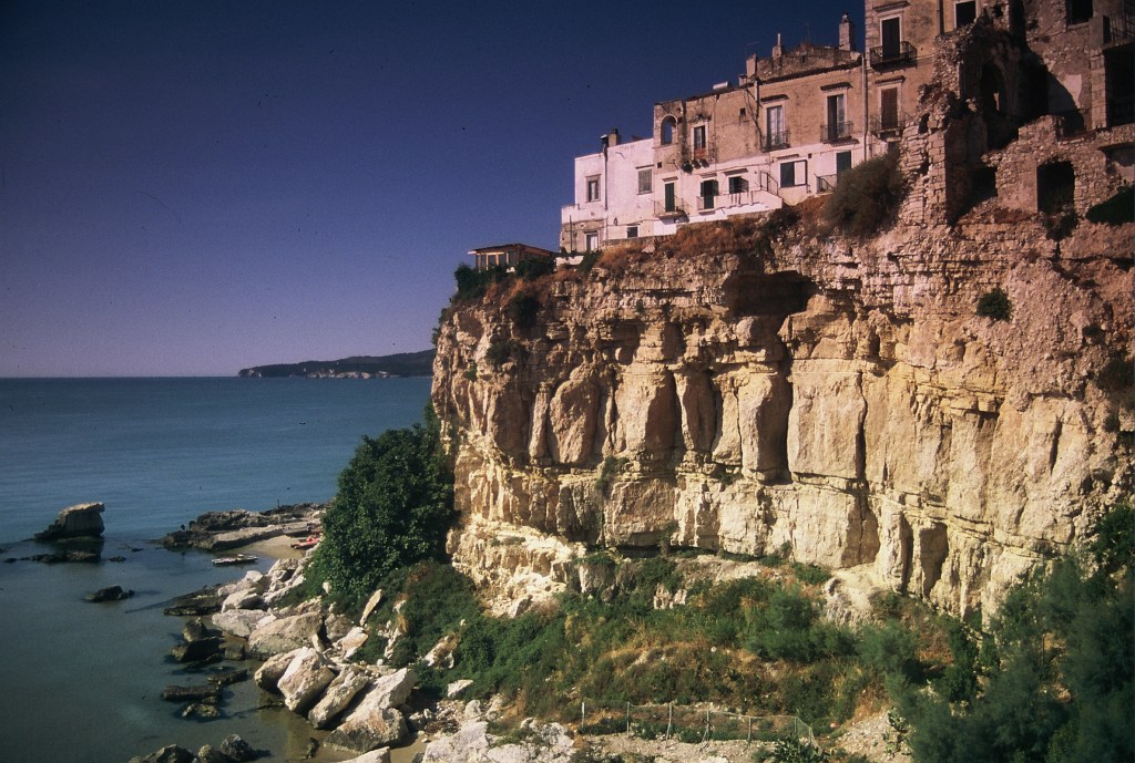 Il bianco abitato della splendida cittadina di VIESTE si erge, dall’alto del suo sperone roccioso che sprofonda verso il mare, è ben visibile al termine di un lungo arenile; il suo caseggiato (antico borgo marinaro) si adagia, proteso su di un promontorio calcareo (a faglie orizzontali intervallato da falde in selce) verso il mare aperto. Considerata un po’ come la simbolica “capitale” del Gargano (paragonabile per bellezza e splendore alle rinomate località di Amalfi e Positano sulla costa tirrenica), essa ci accoglie con il bianco faraglione detto di Pizzomunno (dal dialetto “punta del mondo”). Il curioso monolito calcareo si erge, coi suoi 26 metri d’altezza, alla fine di una lunga striscia sabbiosa e diviene un insolito punto di riferimento per il turista escursionista che girovaga per il Gargano.