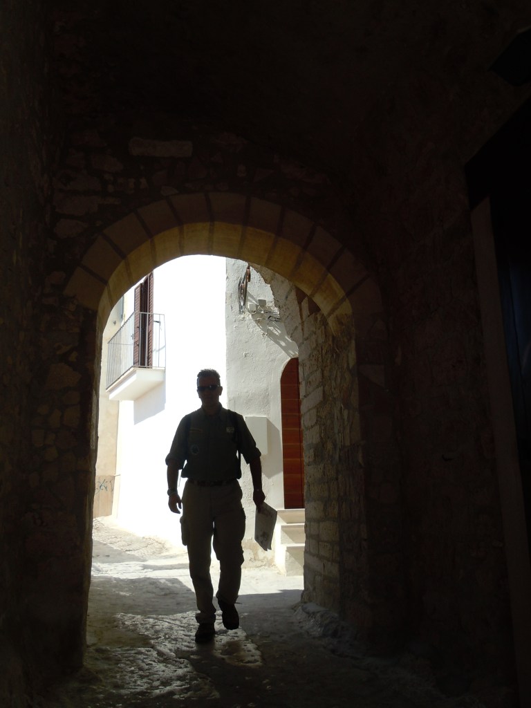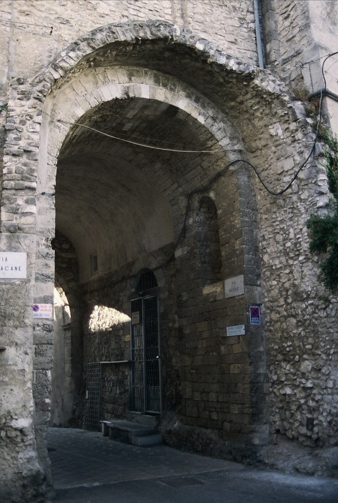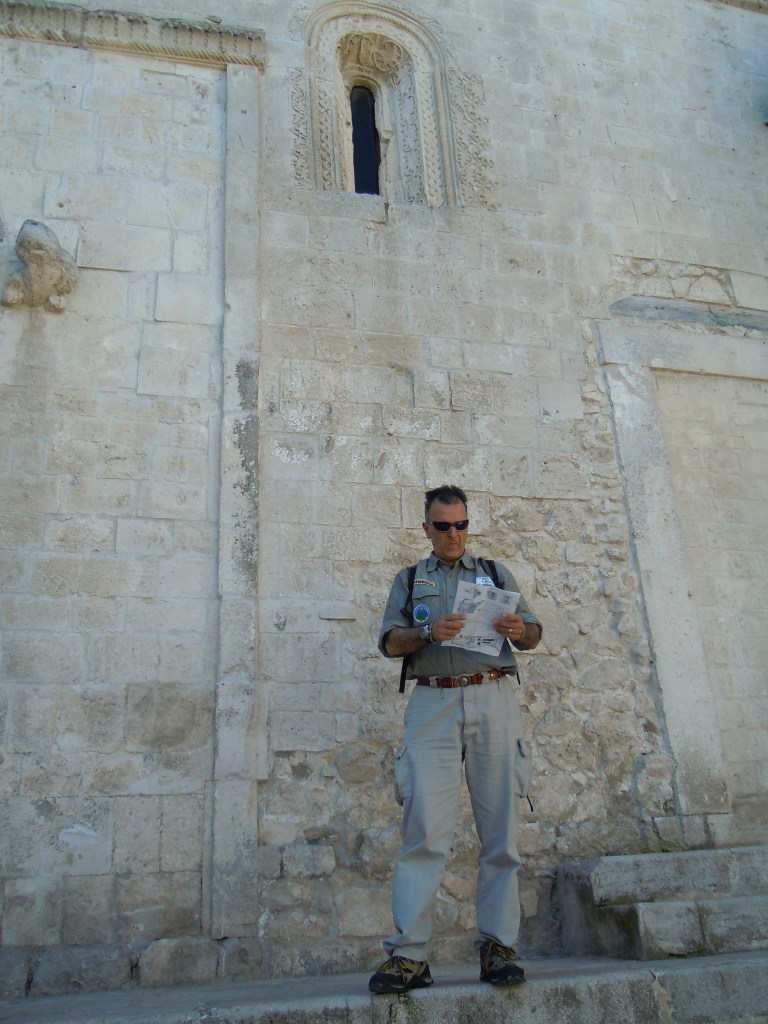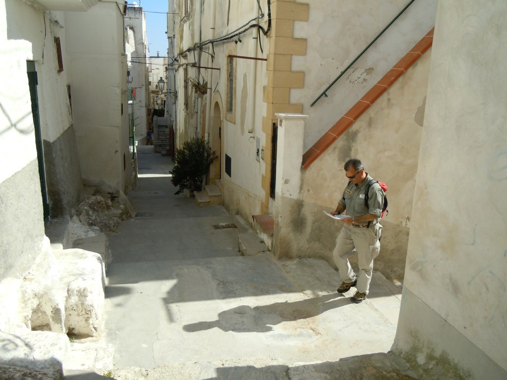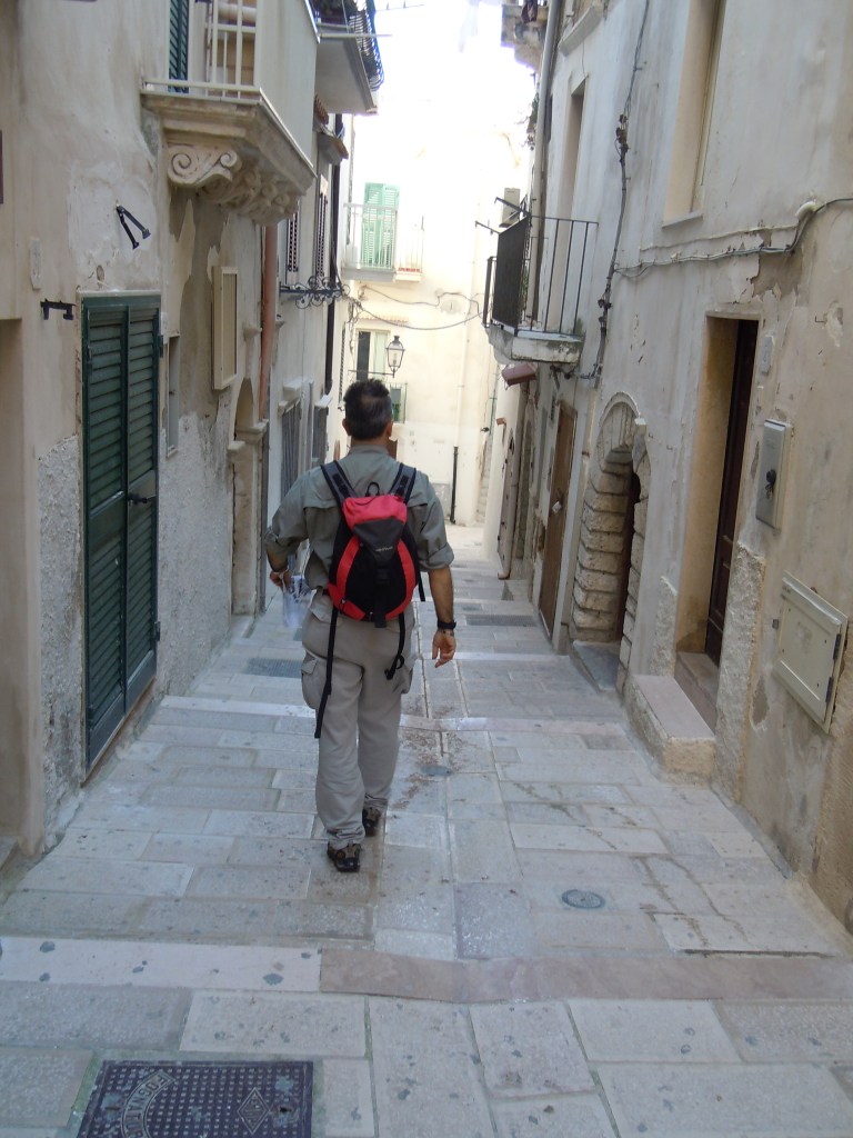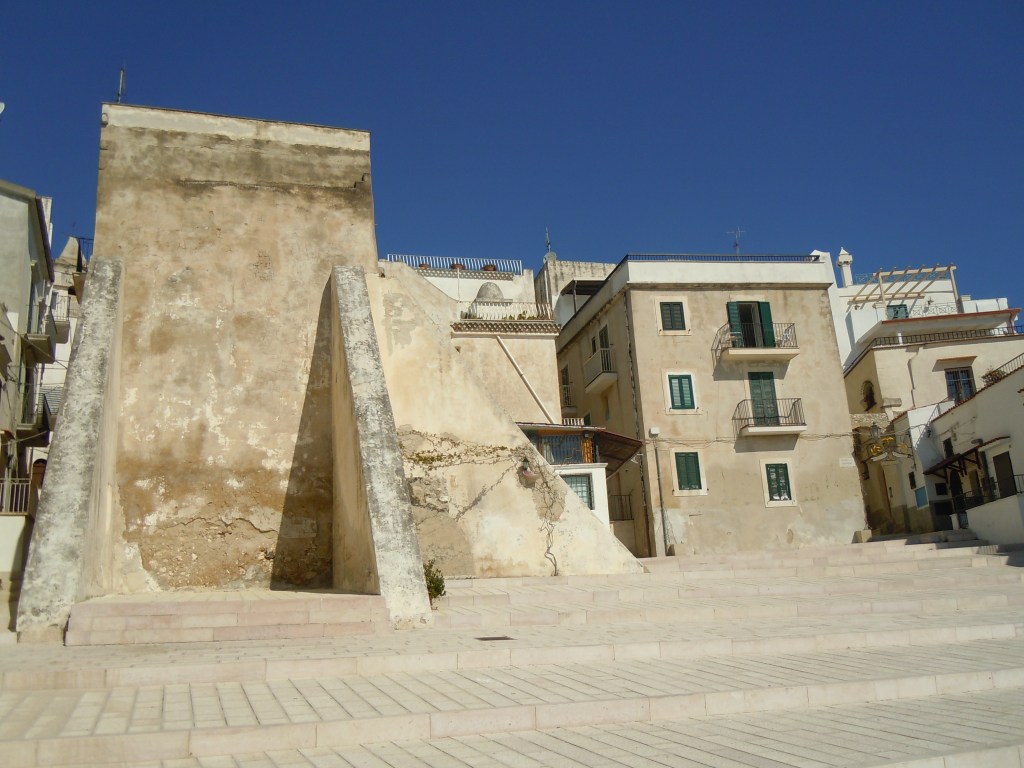 Ma… addentriamoci alla conoscenza dei suoi angoli interni più suggestivi e caratteristii. Attraversati la Porta Ad’Alt si è subito proiettati in un fantastico mondo intriso di medioevo. Una enorme gradinata si para in alto a destra; questa conduce alla Cattedrale (dell’ XI secolo) splendido esempio di architettura romanica-pugliese e poco più su termina sull’ampio piazzale da cui si ergono i bastioni del Castello Svevo (del 1240), ristrutturato e ampliato dagli spagnoli nel 1537. Ci si tuffa nuovamente in quel dedalo di vicoli, archi rampanti, supportici, scale e gradoni, logge e balconi, finestre e cunicoli; elementi architettonici, questi, che vanno a formare la struttura originaria del borgo medioevale ancora in un buon stato di conservazione con viuzze strette, baciate dal sole per poche decine di minuti al dì, e case tutte imbiancate di calce.