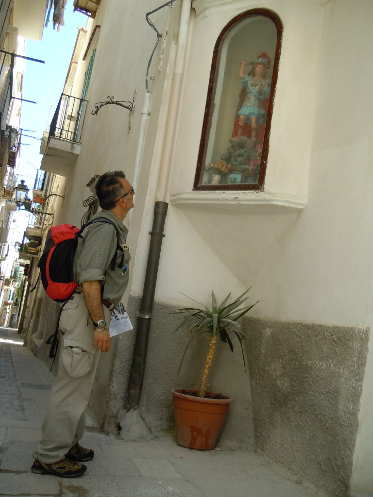 Numerose le edicole votive che si stagliano tra gli angoli più ombrosi e nascosti all’incrocio tra vicoli e porticati; mentre lo sguarda non si stanca mai di correre alla ricerca di spunti curiosi ove potersi nuovamente immergere tra le beatitudini di queste meraviglie. La nostra esploraione di Vieste termina sulla punta estrema del suo promontorio ove si para l’antico Convento di San Francesco che ben si integra con l’originaria struttura di un antico “Torrione” di avvistamento per la difesa costiera. Alla sua destra parte una gradinata scavata nella viva roccia; essa scorre in direzione della scogliera e conduce al “trabucco”, una complessa struttura eretta su palafitte incastrate tra gli scogli (tipica delle coste adriatiche) che serve ai pescatori del luogo come base per le loro attvità.