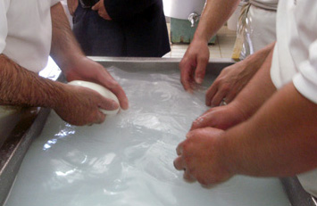Lungo le principali vie di transito si trovavano i “bufalari” che proponevano, ai turisti di allora, le migliori forme di un formaggio fresco ancora sconosciuto: gustosissimo e profumato, vantava un sapore leggermente acidulo. Oggi la lavorazione della mozzarella ha inizio con il versare il latte ottenuto dalle bufale in un calderone che raggiunge 35 gradi di temperatura; al latte viene poi unito il caglio e il tutto riposa per un’ora. La cagliata è sapientemente “spezzettata” in parti fini e lasciata lievitare, poi versata in acqua caldissima, a 80 gradi, temperatura in cui inizia a filare. Una volta eliminata l’acqua, si “mozza” la pasta filata – un tempo rigorosamente a mano – fino ad ottenere la dimensione voluta; solo successivamente le mozzarelle vengono lavate in acqua fredda e fatte riposare in salamoia. Questo formaggio fresco, a pasta molle, cruda e filata, presenta sfoglie sovrapposte dalla crosta sottilissima e gustosa. L’attuale produzione è molto varia e propone forme tonde di diverse dimensioni, ma anche bocconcini, pani e trecce. Nel 1996 la mozzarella di bufala campana ottiene il marchio D.O.P. (Denominazione di Origine Protetta, si tratta del quinto formaggio italiano a ricevere questo riconoscimento), a testimonianza delle sue qualità e della particolarità delle sue origini, legate fortemente al territorio campano. Oggi esiste un Consorzio di Tutela della mozzarella di bufala campana D.O.P. che ne regola norme di produzione e vendita. (tratto dalla guida “CAMPANIA Zaino in Spalla” di ©Andrea Perciato)