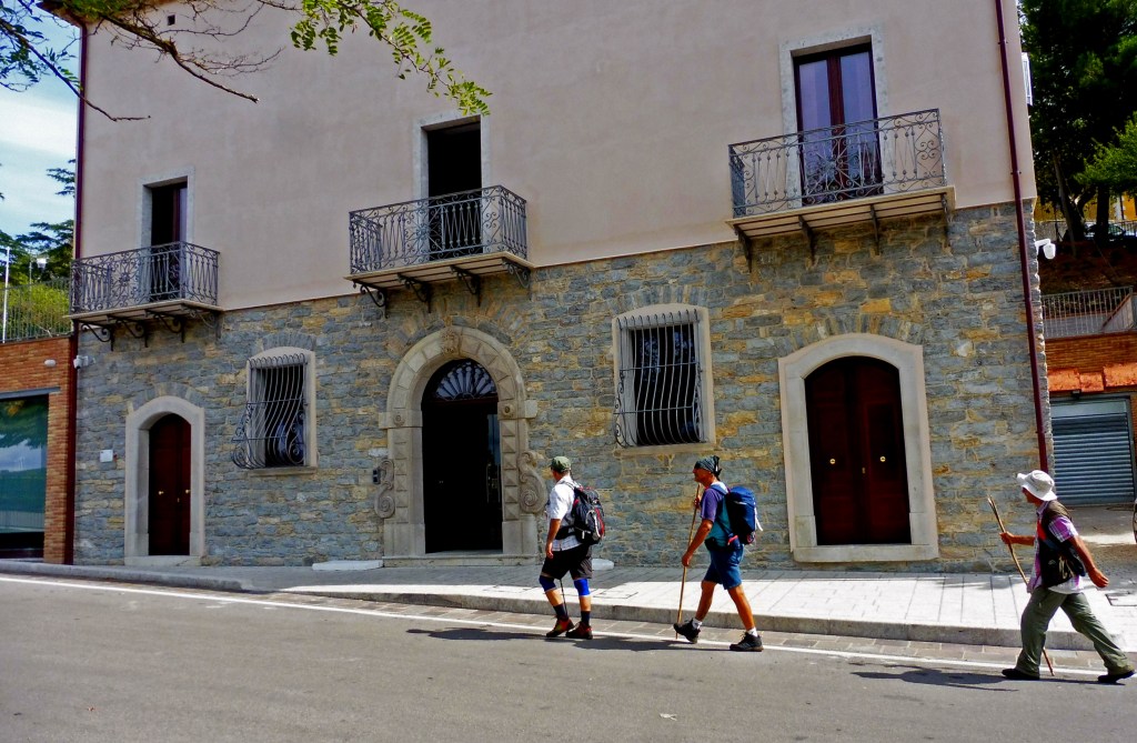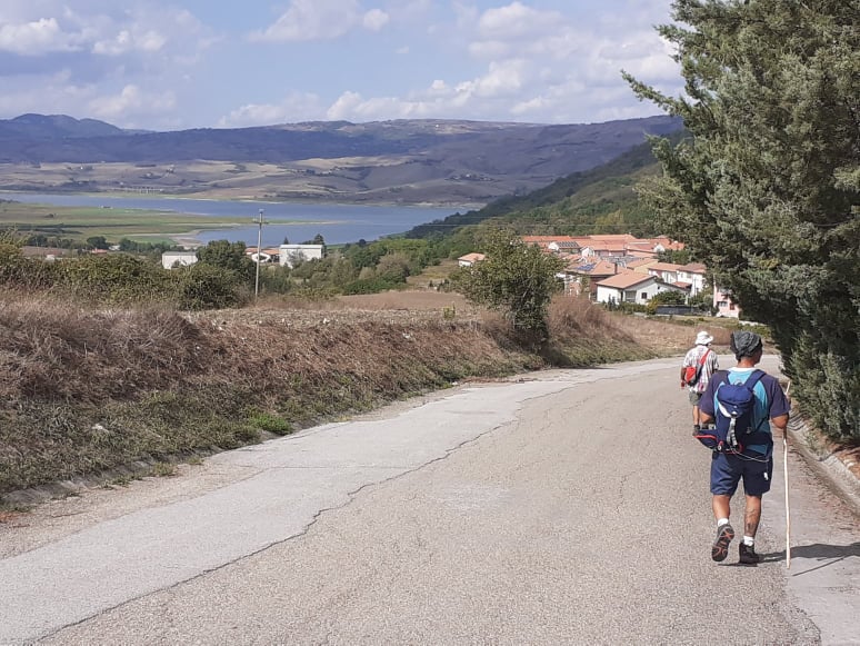 Eccolo il nuovo centro abitato di CONZA della CAMPANIA (AV) ove ci accoglie il sindaco che mette a nostra disposizione uno spazio di accoglienza (vecchio centro sociale) per feste parrocchiali e incontri culturali. Qui siamo proprio al centro di quello che ancora si ricorda come l’Occhio del Cratere che scatenò la violenta onda tellurica che distrusse per sempre questi luoghi ed ha termine la terza tappa del Cammino. Una bella scarpinata serale ci consente di raggiungere a piedi la rupe ove sorgeva l’antico abitato di “Compsa” completamente distrutto dal sisma e che ha restituito le antiche tracce della presenza di Roma a queste latitudini; luoghi già frequentati dai Romani che da qui controllavano il transito di merci e carovane lungo la vicina “consolare” Appia; lo spettacolo che offre il tramonto sul lago di Conza è di una bellezza unica.