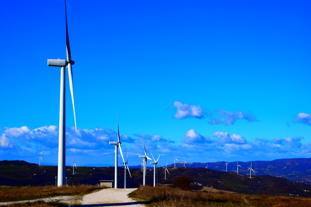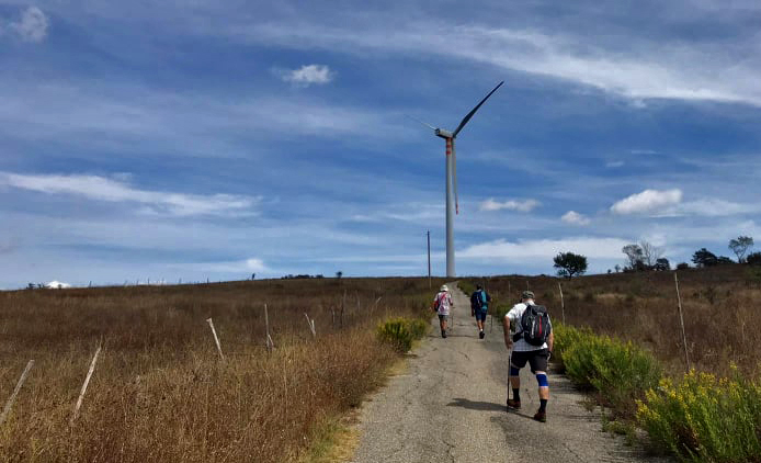 Poche decine di metri e si prende la prima deviazione che sale a destra attraversando un paesaggio tipicamente rupestre (Via della Seta), ampio e soleggiato, caratterizzato da terreni incolti, aridi e non sempre curati. La linea dell’orizzonte, proprio sopra i nostri occhi, è costellata dalle pale eoliche che scorrono sul crinale di confine con la Basilicata. Raggiunte le pale eoliche che determinano il profilo orografico, autentiche “sentinelle del vento”, il panorama cambia completamente offrendo alla vista paesaggi bucolici di notevole bellezza: la verde Irpinia e il bacino lacustre del lago di Conza. Finalmente si giunge al cospetto delle “bianche sentinelle di crinale” che – come austeri gendarmi – controllano (e catturano i venti tramutandoli in fonte energetiche) gli incredibili orizzonti che s’aprono a S, verso l’alta valle del Sele, e a N sulla valle dell’Ofanto con l’omonimo lago (Oasi WWF lago di Conza) ricavato dall’invaso; quassù, durante le giornate ventose, le eliche di queste pale fanno sentire il proprio ululato, mentre ripararsi dalle raffiche è impossibile.